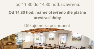 Z dลฏvodu konรกnรญ soukromรฉ akce bude naลกe restaurace pลes obฤdy uzavลena. Dฤkujeme za pochopenรญ. read more