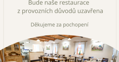 Restaurace 26.8.2023 xadm2023-09-12T10:42:57+02:00 xadm Aktuality 0 Comments Z důvodu konání svatby bude naše restaurace dne 26.8.2023 celý den uzavřena. Děkujeme za pochopení a těšíme se na Vaši návštěvu v jiný den. Share this post Facebook Twitter LinkedIn Google + Email WhatsApp Author xadm Napsat komentář Zrušit odpověď na komentářVaše e-mailová adresa nebude zveřejněna. Vyžadované informace jsou označeny *Komentář * Jméno * E-mail * Webová stránka Uložit do prohlížeče jméno, e-mail a webovou stránku pro budoucí komentáře.